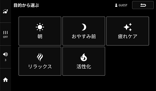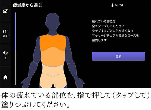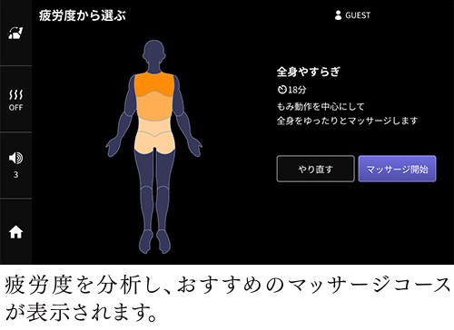 大型タッチパネルの直感的な操作で、ユーザーの疲れている部位をタッチ選択、AIが分析してコースを提案する「疲労度から選ぶ」、他に「目的から選ぶ」「コース履歴」などユーザーの身体の状態や疲れに寄り添った適切なメニューを引き出し、感動のマッサージ体験へ導きます。