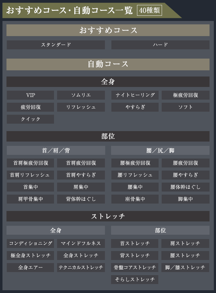 コンディショニングマッサージを実現する40種類のコースメニュー