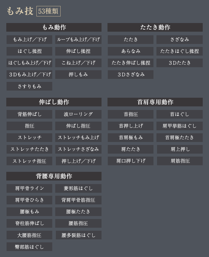 こだわりの全53タイプのポイント集中マッサージから選ぶことができます。