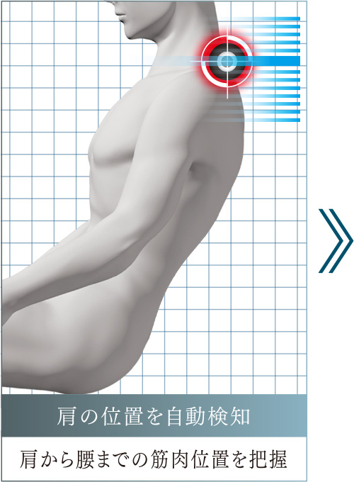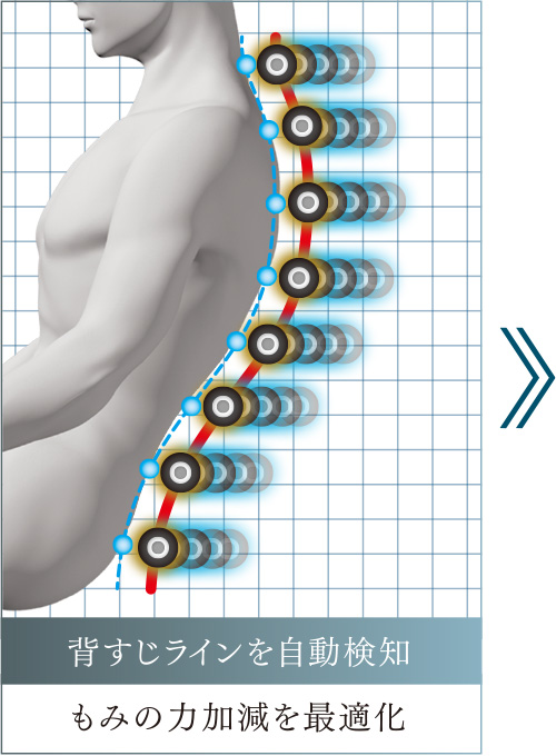 肩位置を検出する「肩位置検知システム」によりマッサージポイントを割り出し、さらに「S字ライン検知システム」が8か所のセンシングを行うことで背すじラインを検出します。この背すじラインに沿って「5D-AIメカPLUS」が均一に自動調節された心地よいマッサージを実現します。
