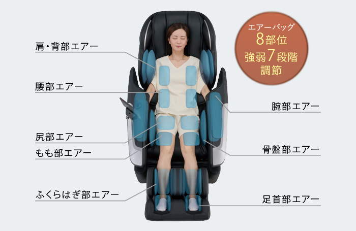 全身をエアーバッグで包みこんで、たまった疲れをスッキリ解放します。全身8部位のエアーバッグは7段階で調節可能です。