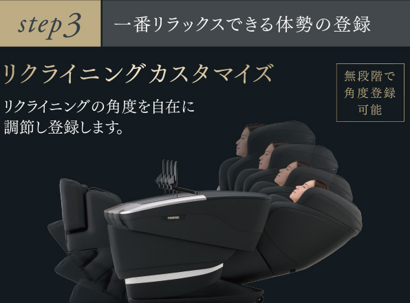 ユーザーの肩位置、背すじライン、エアーの力加減、リクライニング角度を細かく調節しマッサージチェアに登録できます。(最大2名分)