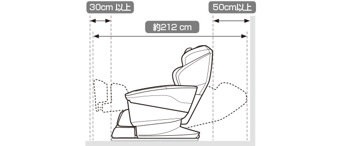 前方向に30cm以上、後方向に50cm以上のスペースをあけてください。